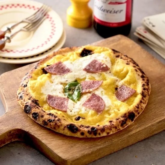 創業当時から大人気のThat's PIZZAシグネイチャーピザとも言える甘いコーンソースとリコッタチーズをベースにアクセントにサラミをトッピングした、甘味と塩味が癖になる病みつきになる1枚です。